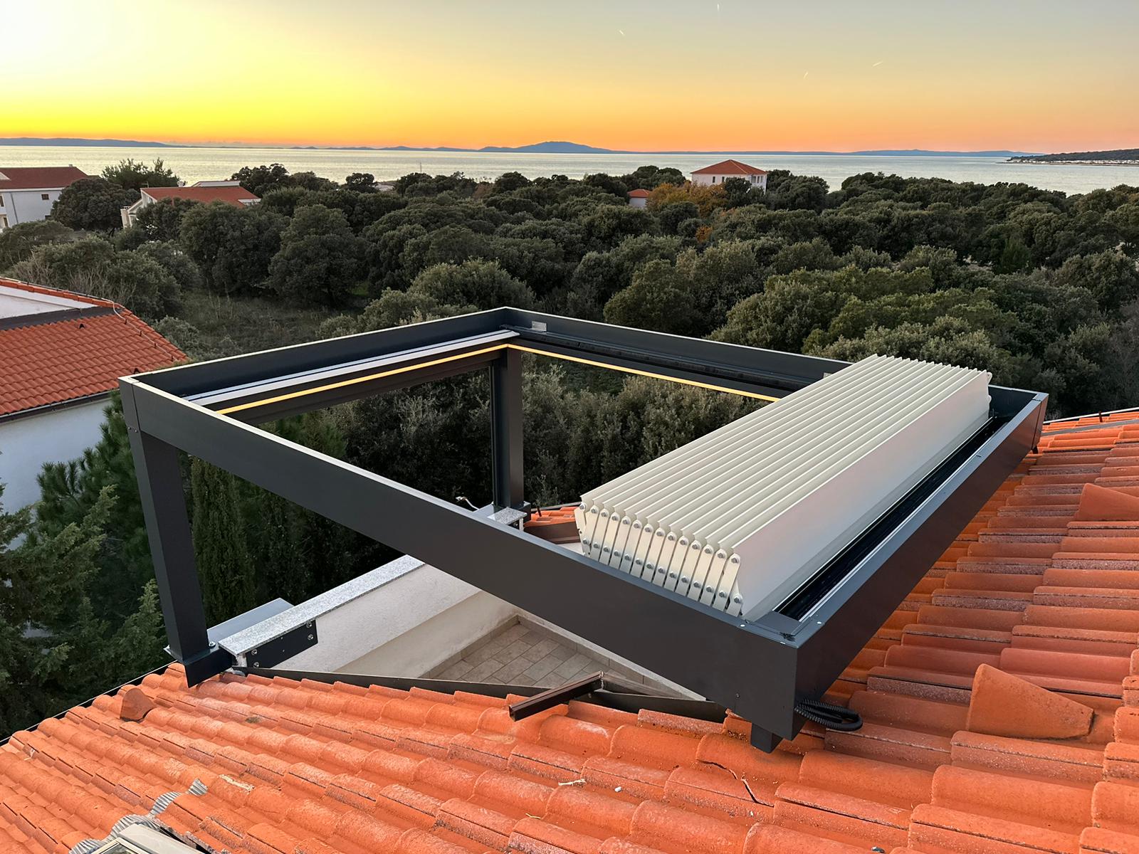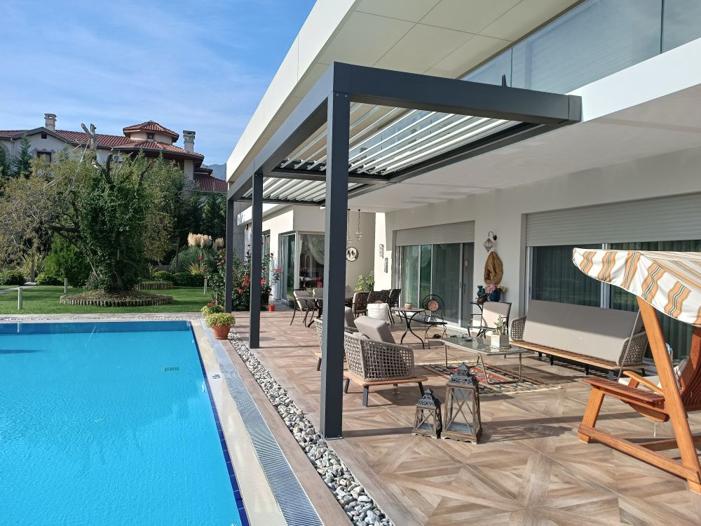 Bioclimatic pergolas combines sliding and rotating aluminium slats with retractable panels for all‑weather shade, ventilation and waterproof comfort, complete with remote control and integrated drainage